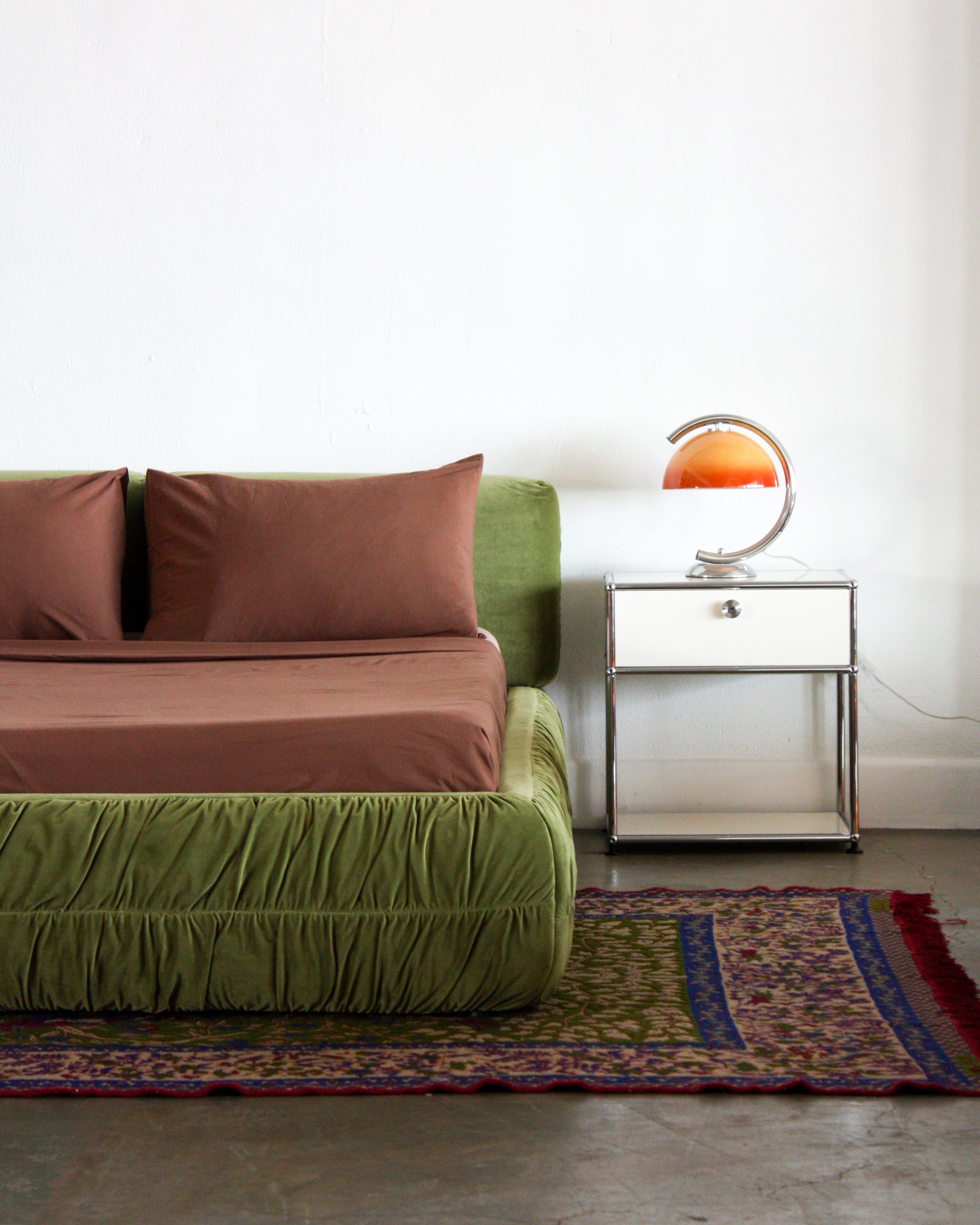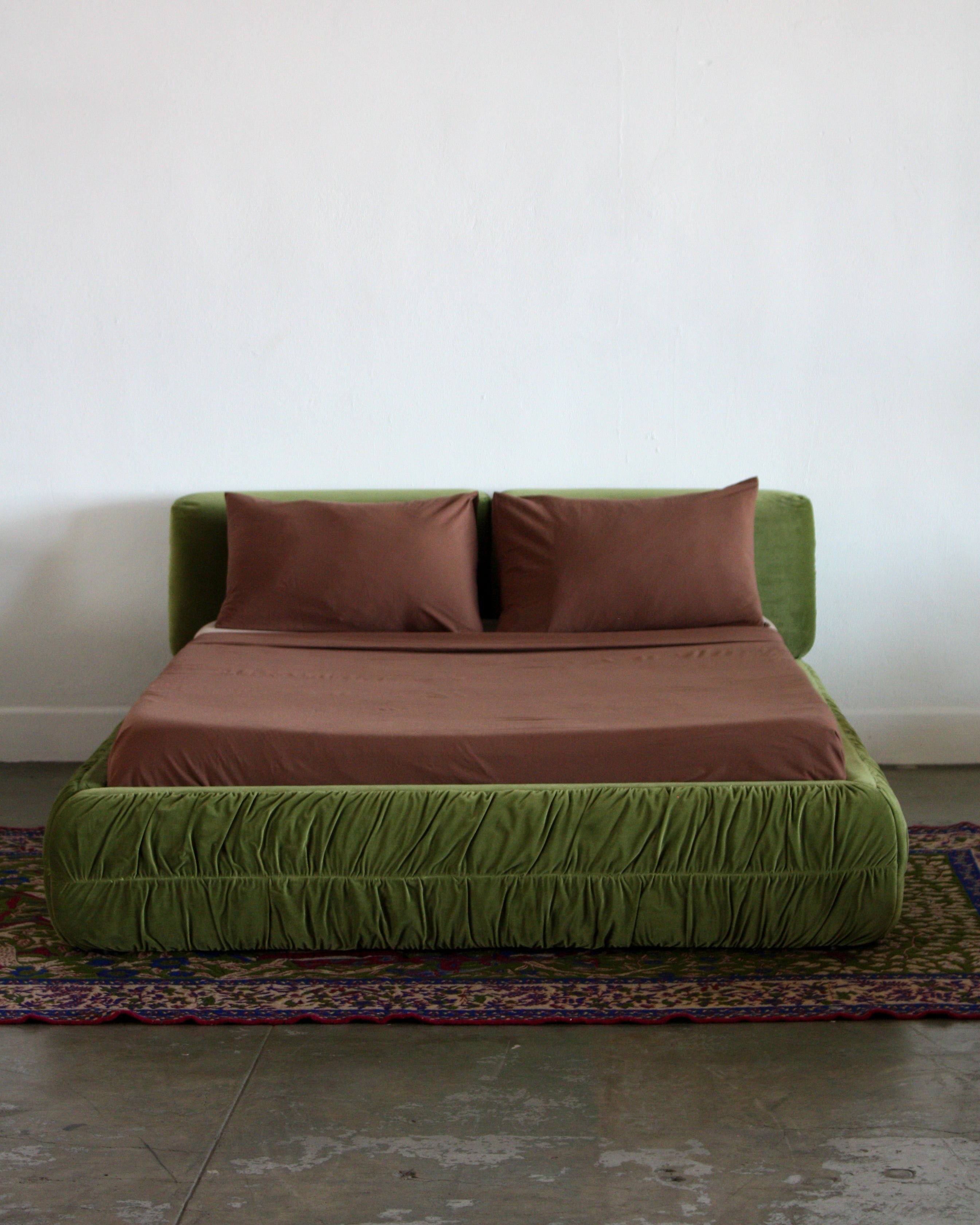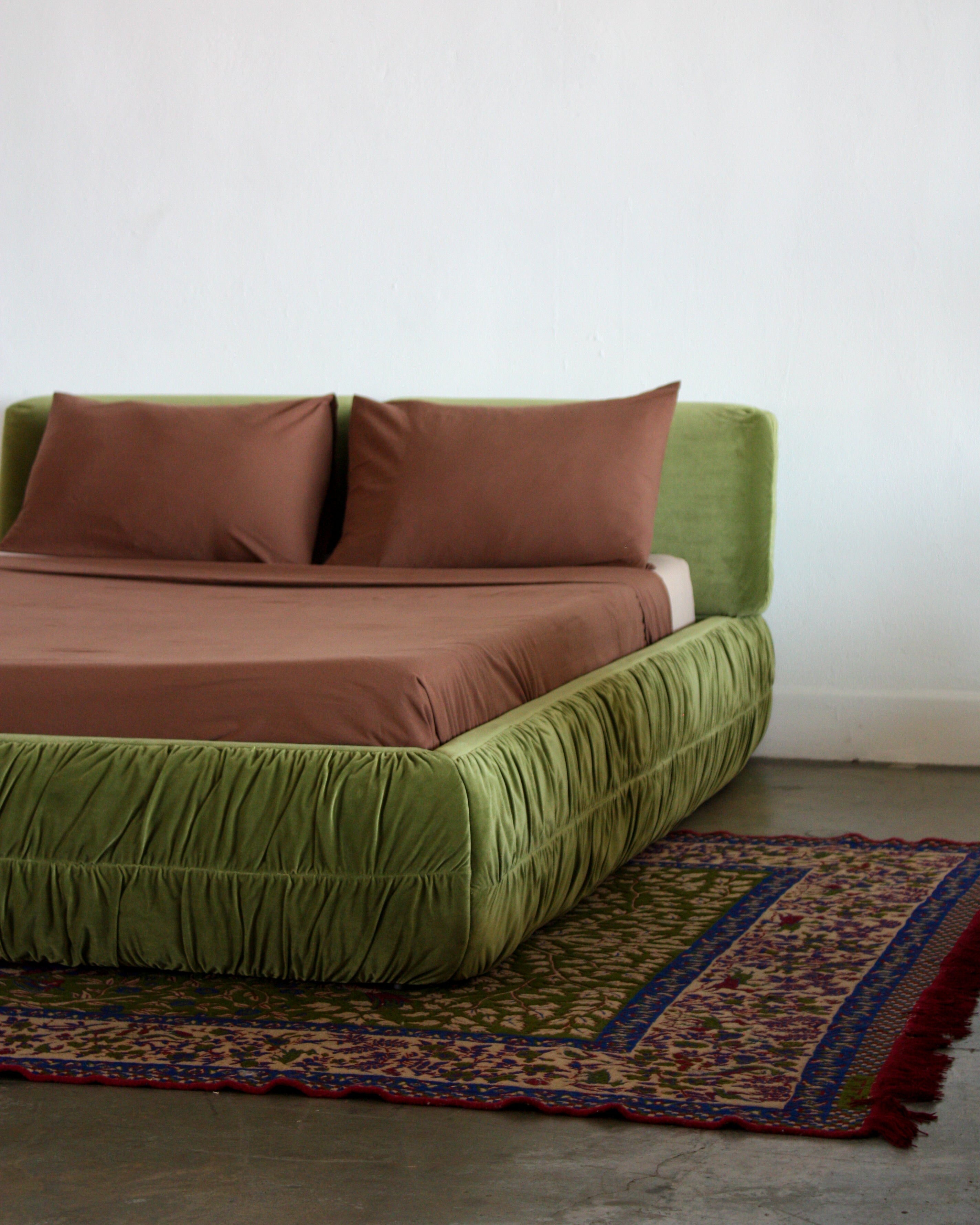 The Mira Bed is designed to bring quiet beauty to the everyday. With its low, sculptural frame and softly gathered velvet upholstery, Mira balances structure and softness in perfect harmony.