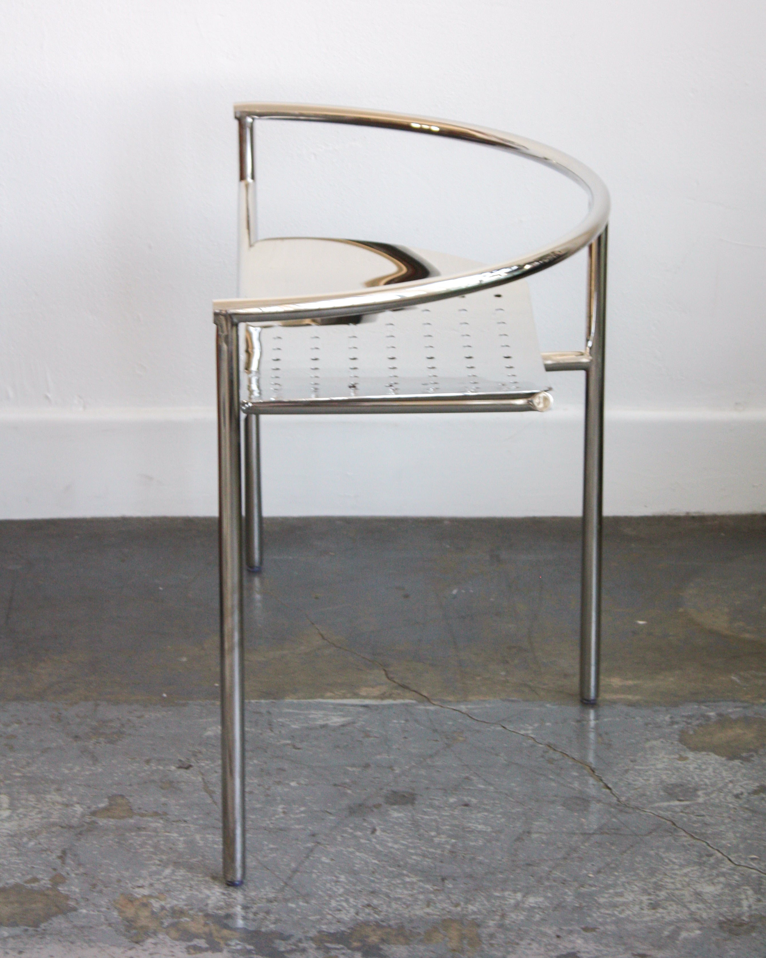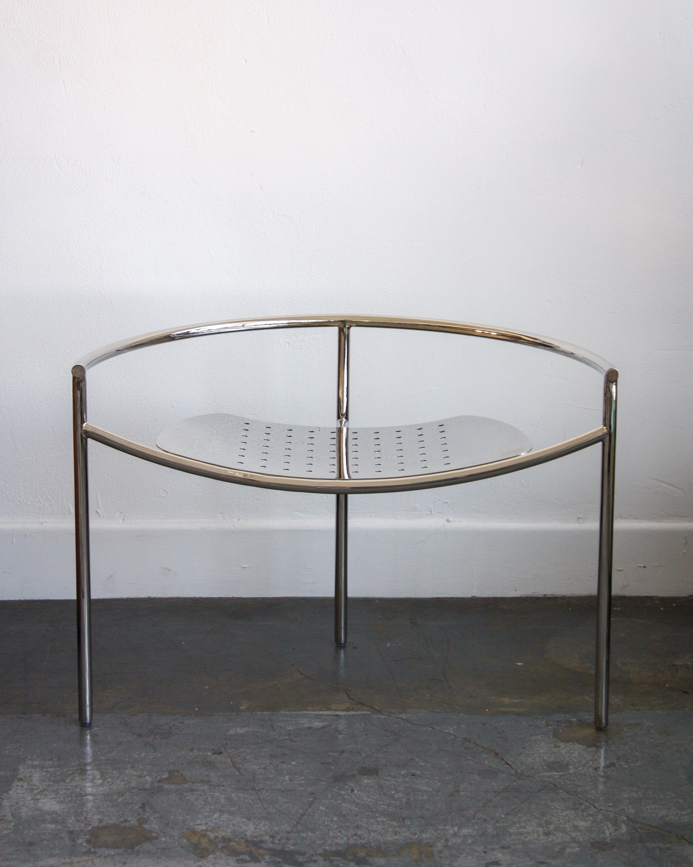 Sculptural, minimal, and quietly bold. The Orbit Chair features a circular stainless-steel frame balanced on three slender legs, giving it a light, floating presence. The wide seat makes it a standout accent chair - more lounge than dining, perfect for creating a focal point in modern spaces.